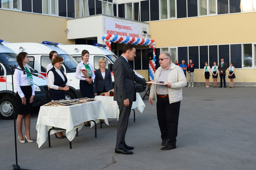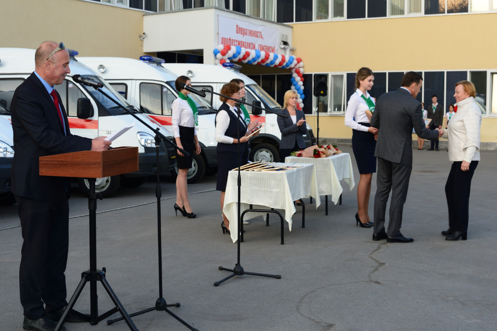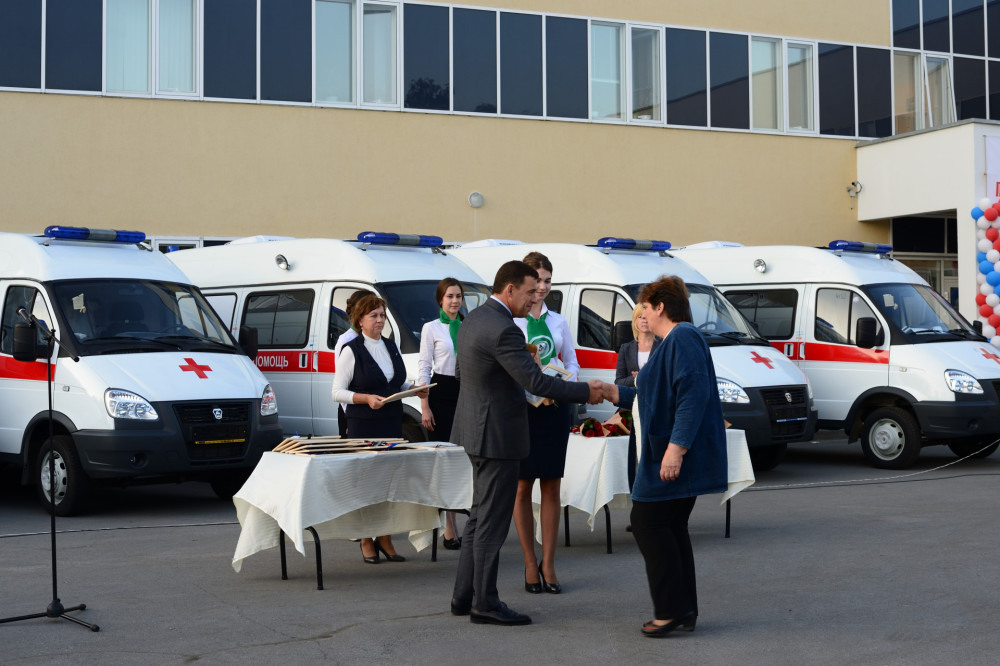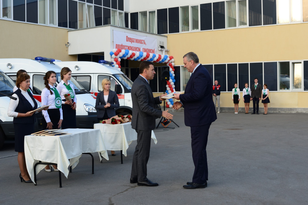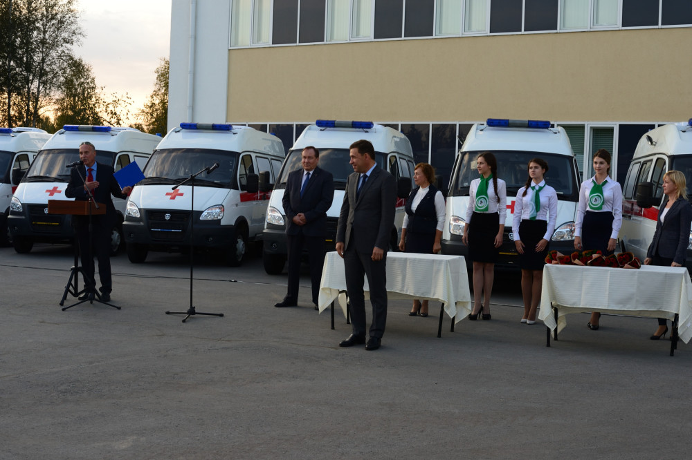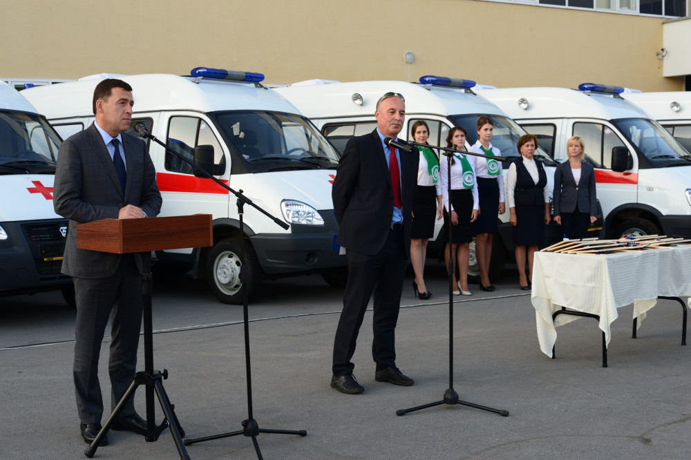 Передачу ключей и документов на полностью укомплектованные автомобили класса "В" и "С", а также на передвижные фельдшерско-акушерские пункты представителям муниципальных образований и руководителям учреждений здравоохранения области проводили Губернатор Свердловской области Е.В. Куйвашев и Министр здравоохранения Свердловской области И.М. Трофимов.