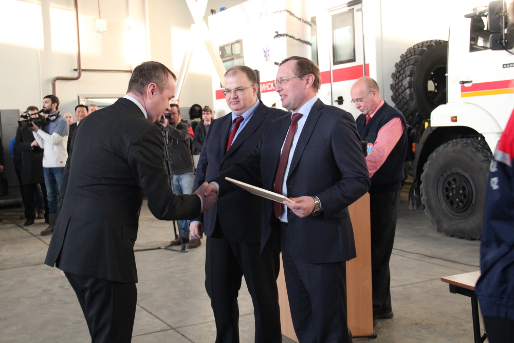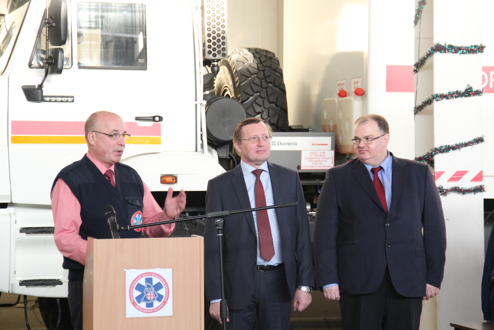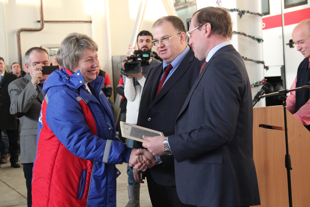 Передачу ключей и документов на полностью укомплектованные автомобили класса "В" и "С" представителям муниципальных образований и руководителям учреждений здравоохранения области проводили заместитель Губернатора Свердловской области П.В. Креков и Министр здравоохранения Свердловской области А.И. Цветков.