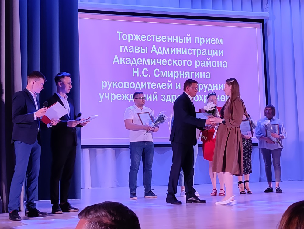 Специалистов ТЦМК накануне Дня медработника чествовали и в ходе торжественного приёма главы Администрации Академического района. Благодарственные письма получили Дмитрий Симонов, врач акушер-гинеколог, заведующий акушерским реанимационно-консультативным центром, Александр Попов, детский врач, анестезиолог-реаниматолог, Дарья Наумова, медсестра оперативно-диспетчерского отдела (диспетчер по приему вызовов), Лариса Дробатухина, заведующая аптекой ТЦМК.