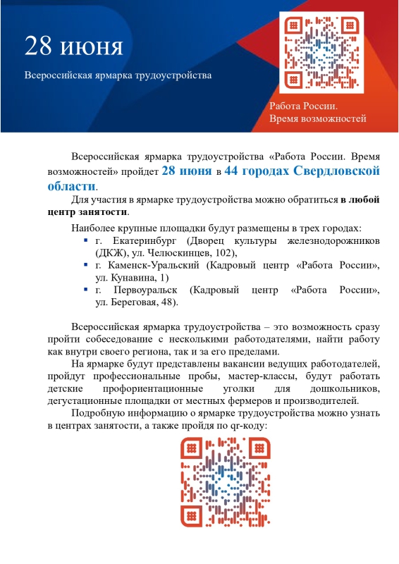 28.06.2024 государственными казенными учреждениями службы занятости населения Свердловской области будет проведена Всероссийская ярмарка трудоустройства «Работа России. Время возможностей», время начала мероприятия в 10.00 часов.