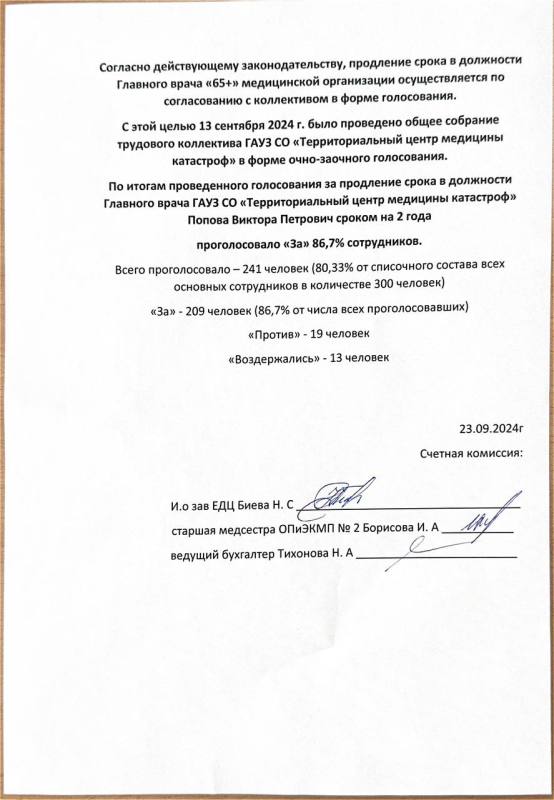 Итоги проведения голосования за продление срока в должности Главного врача ГАУЗ СО ТЦМК